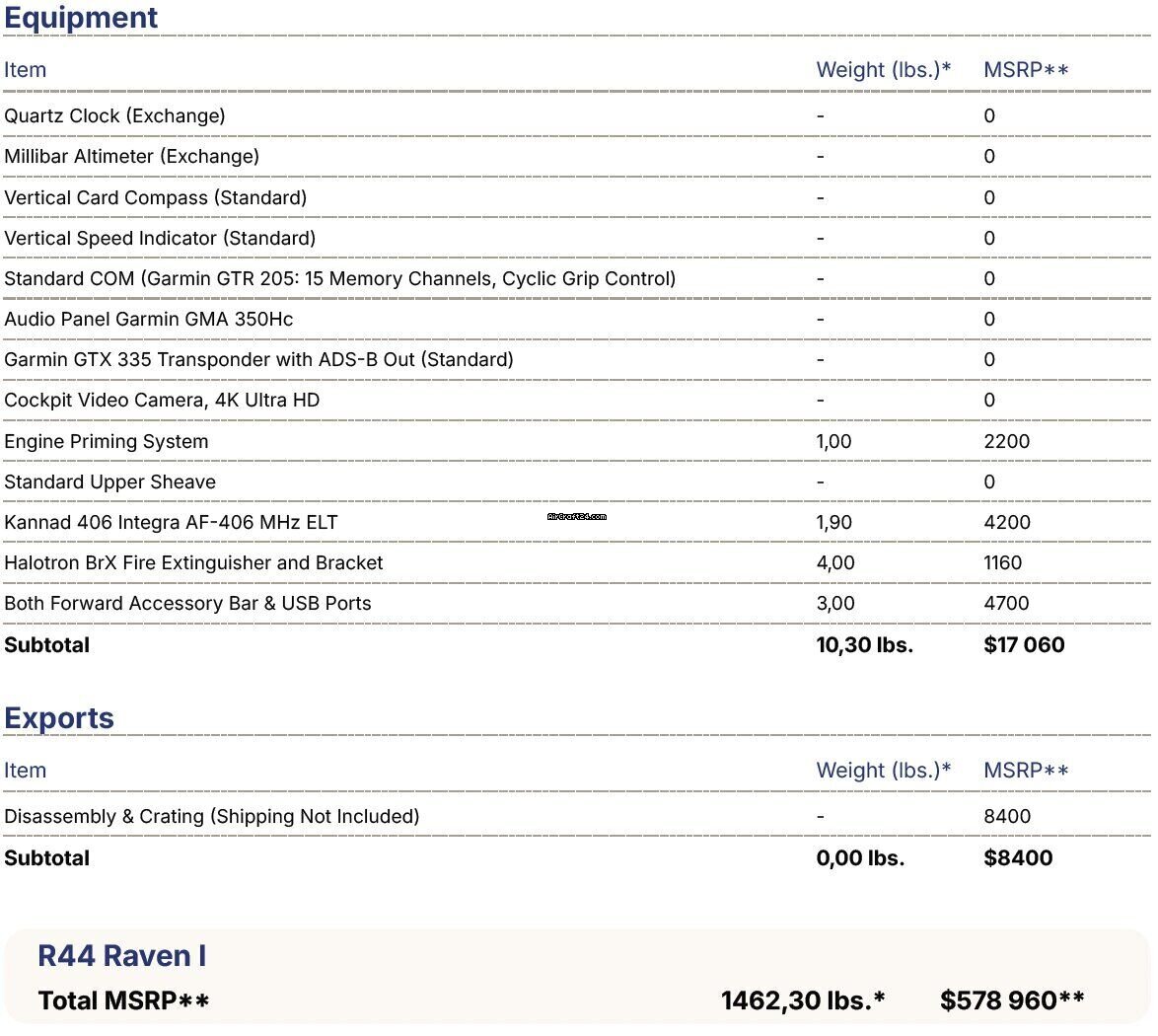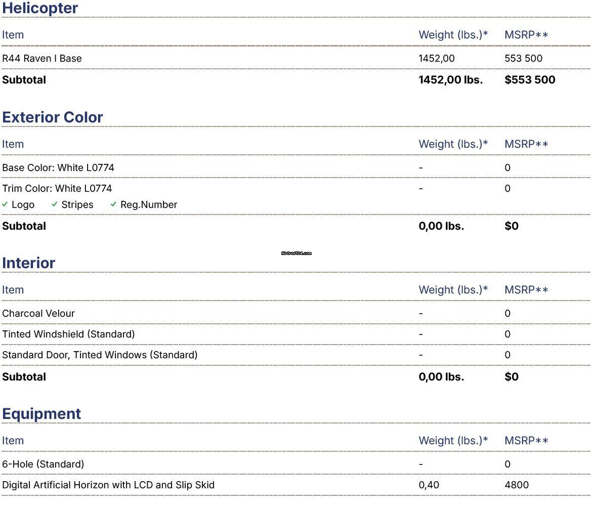 | 概况 | | 类型: | 直升机 (活塞) | | 品牌: | Robinson | | 型号 1: | R44 | | 制造年: | 2023 | | 注册号: | SP-SOW | | 系列号: | 2766 | | 地点: | 波兰 | | 时间总计: | 1700 h | | 价格: | US$ 360.000 | | 细节 |