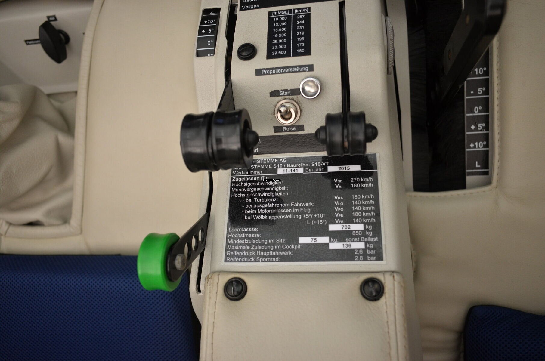 | 其他 | | Das Flugzeug wurde vor 2 Jahren in der Halle stehend durch abst黵zende Tr黰merteile eines UL Flugzeuges besch鋎igt. Alle Sch鋎en wurden seitdem durch die Firma Stemme fachgerecht instandgesetzt. Die Kabinenhaube ist neu. Das Flugzeug ist eine der letzten S10 und wurde initial in die USA als Demonstrator/Messeausstellung mit "Vollausstattung" verkauft. |